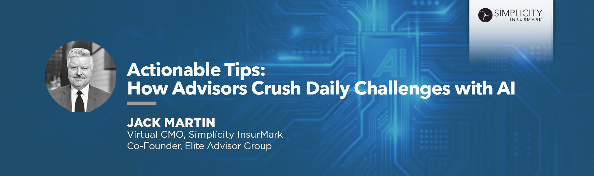 As we noted in our recent blog, Industry Insights: The Impact of AI on Advisory Firms, advisors who don’t invest in AI technology, “will get left in the dust.” That’s according to Simplicity InsurMark Virtual CMO Jack Martin.